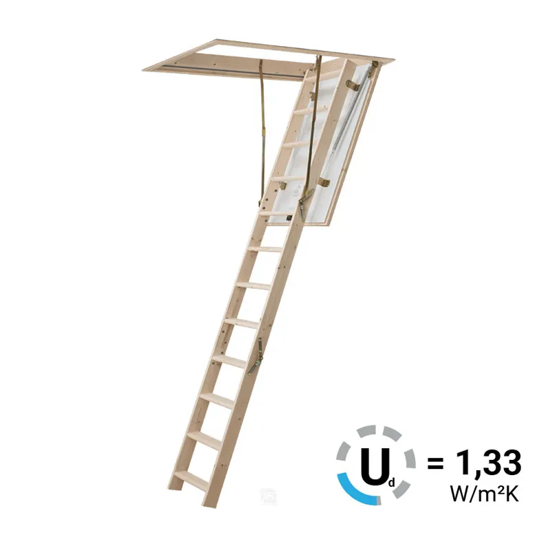 В комплекте: люк из сэндвич-панели, пружинный механизм "короб-люк", короб, трехсекционная лестница с сосновыми ступенями, замок люка, штанга для раскладывания лестницы.