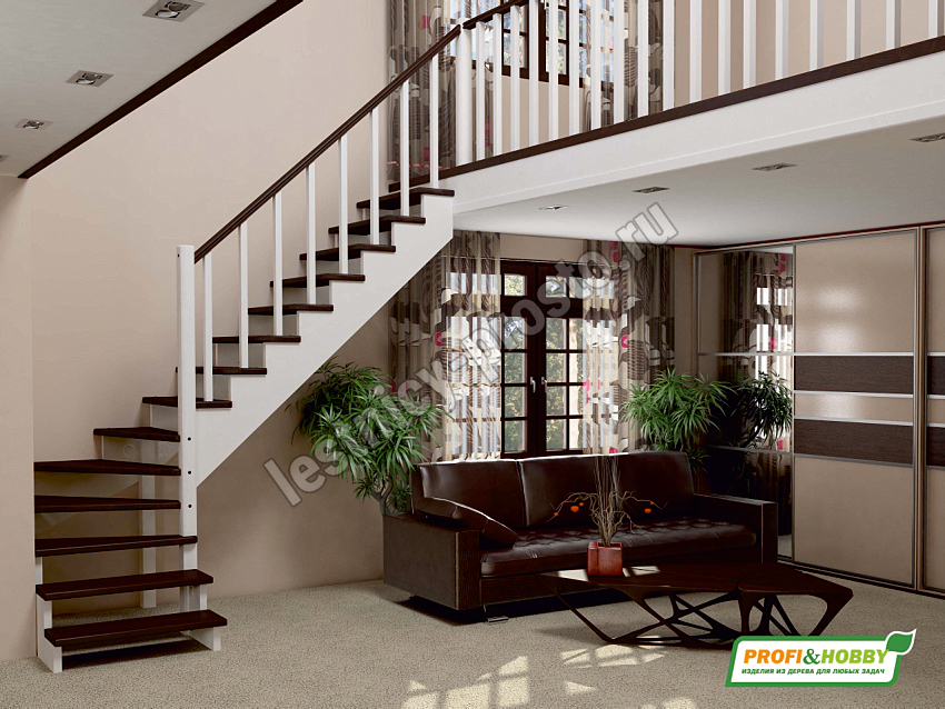 Цена указана за лестницу с дубовыми ступенями и поручнем, остальные элементы - сосна. Возможно изготовление этой лестницы целиком из дуба. Базовый комплект включает в себя деревянные элементы лестницы и ограждения без какого-либо покрытия.