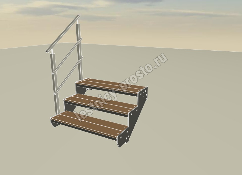 Ступени лестницы состоят из металлической рамки, обеспечивающей необходимую прочность, и покрытия из террасной доски ДПК (древесно-полимерный композит). Ступени не боятся воды и мороза, не теряют со временем свой внешний вид и не требуют ухода.
