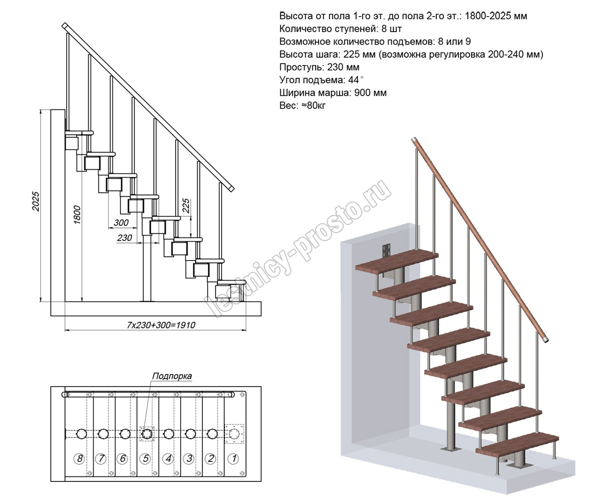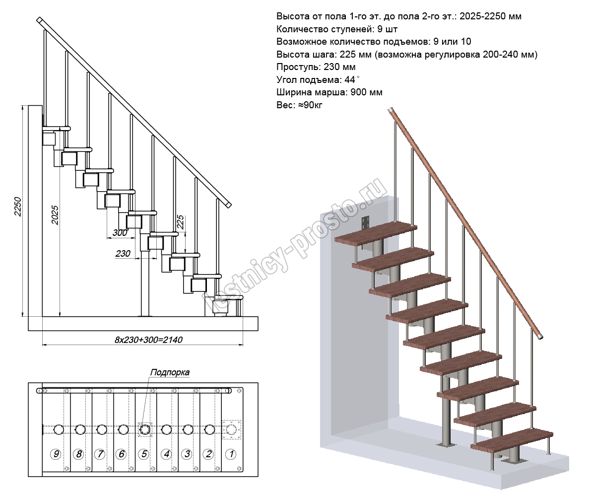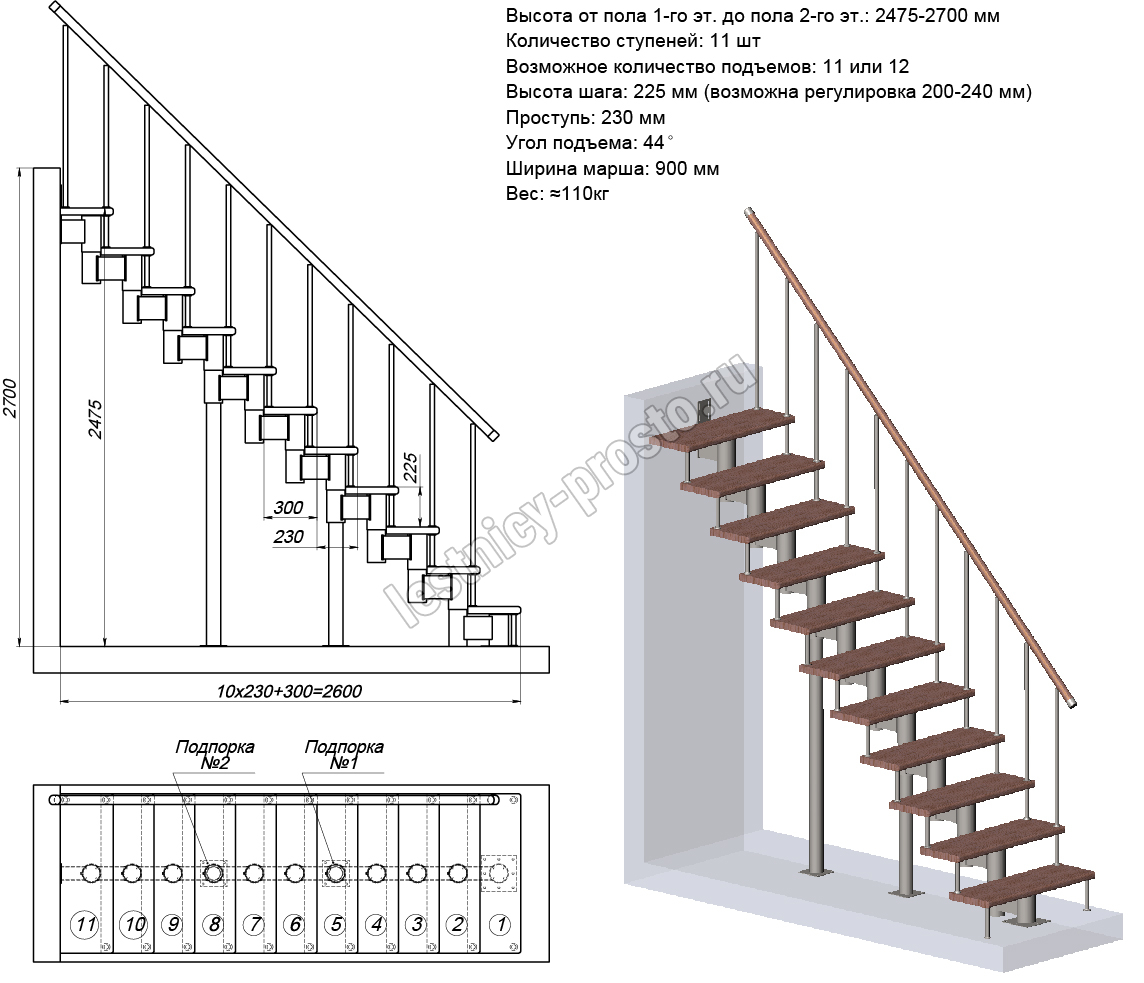 Универсальная, модульная лестница позволяет при сборке регулировать высоту шага в диапазоне 200 - 240 мм.