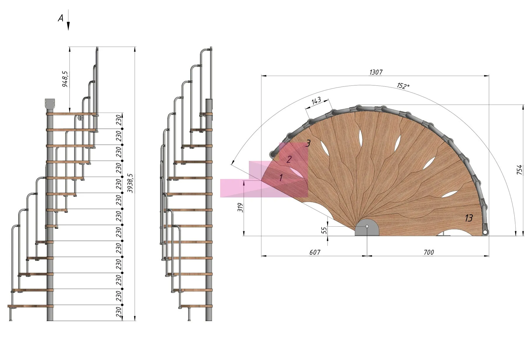 Винтовая лестница PROSTO MINI 70×140 см, h299-322 см